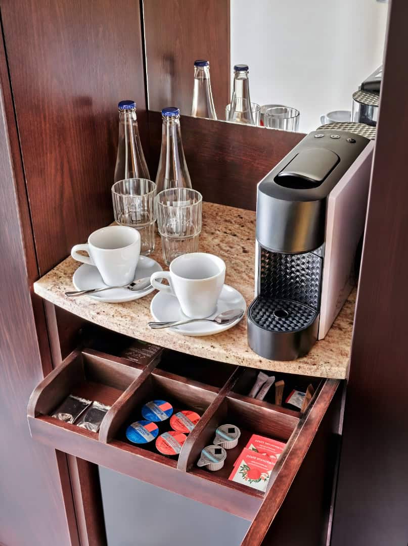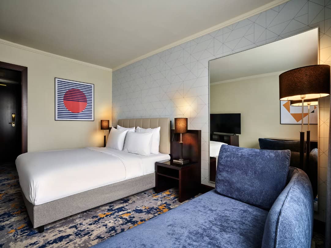 This fully renovated room features a Queen bed, a Smart TV, and a Julius Meinl coffee machine for your morning ritual. Guests also enjoy exclusive access to the Club Lounge on the top floor, offering complimentary snacks and drinks throughout the day.